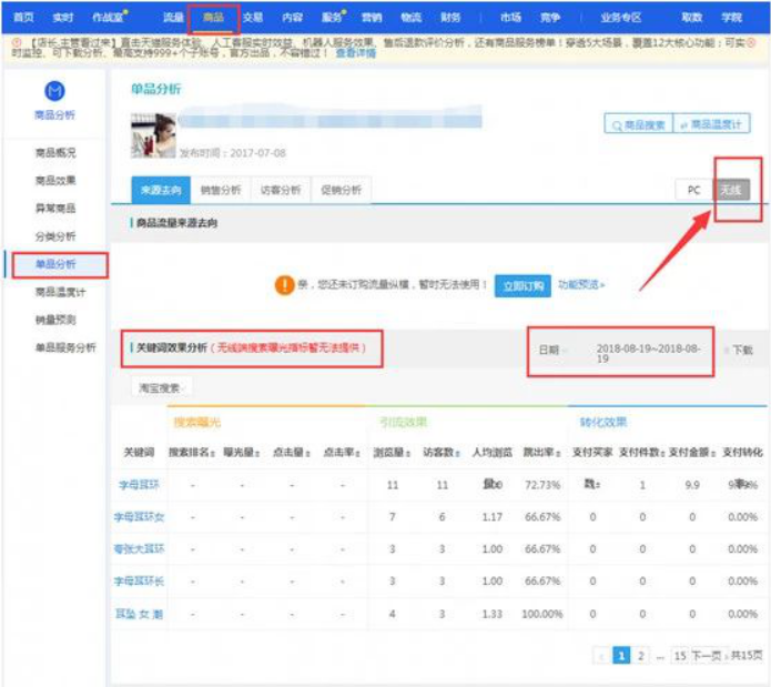 有访客的情况下标题是不能瞎改的,我们一定要先看过标题关键词哪些是引流关键词,哪些是排名靠前能帮我们获取到访客的。查看方法:生意参谋 流量 商品流量排行TOP10 趋势分析 商品效果 单品分析 关键词效果分析,查看无线端数据(选择日期一天一天的去下载数据,查看最近14天的进店关键词情况,把关键词合并到一个表格)。
