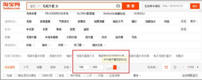 比如你的销售价格是在第三个价格柱(53——97之间),然后你如果准备上的新品,在搜索核心关键词的时候,只要也在这第三个价格柱,那就可以,就不会让你的价格标签混乱。比如冬天你准备卖“毛呢外套”,那你就搜索:毛呢外套 女