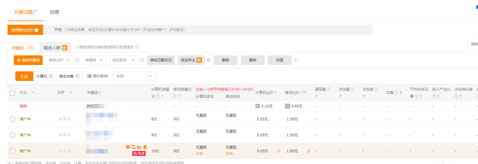 我们测款的工作就算完成了。测款最主要的是拿到数据。很多小伙伴觉得太贵,于是选持久战,多测几天,但是综合考虑来说,扣费也差不了多少,而且因为耗时过多,反而会延迟我们的宝贝推广计划,得不偿失。